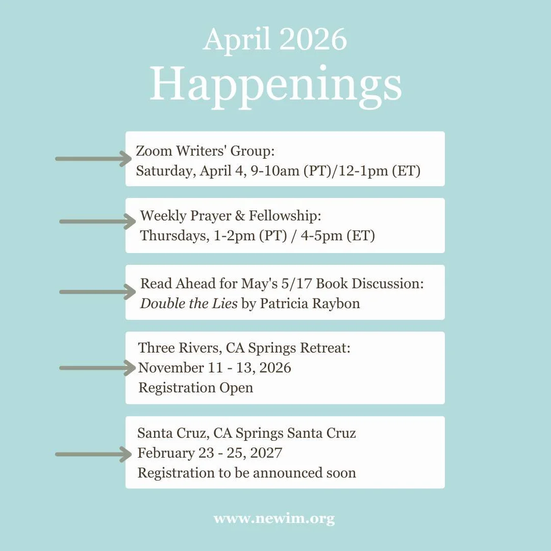 Join us for our monthly Writers Group (generally the first Saturday at 9 a.m. PST) for an hour of sharing our writing and encouraging each other via zoom. Mark your calendars now for the Writers’ Getaway, November 10-11, 2026. Cost: $199. In-person at St. Anthony’s Retreat Center, Three Rivers, CA.